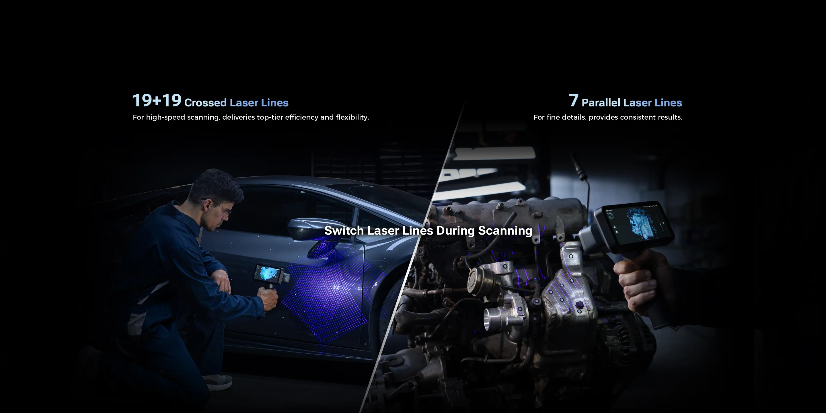 Hız için çapraz lazer, detay için paralel lazer modları. Tarama sırasında anlık geçiş yapılabilir.