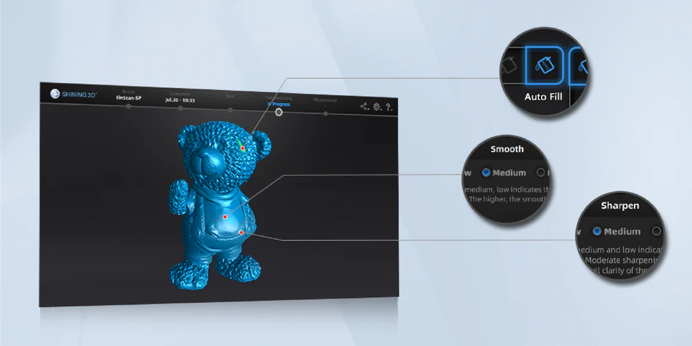Delik doldurma, yumuşatma, keskinleştirme ve koordinat düzeltme gibi güçlü post-processing araçları sunar.